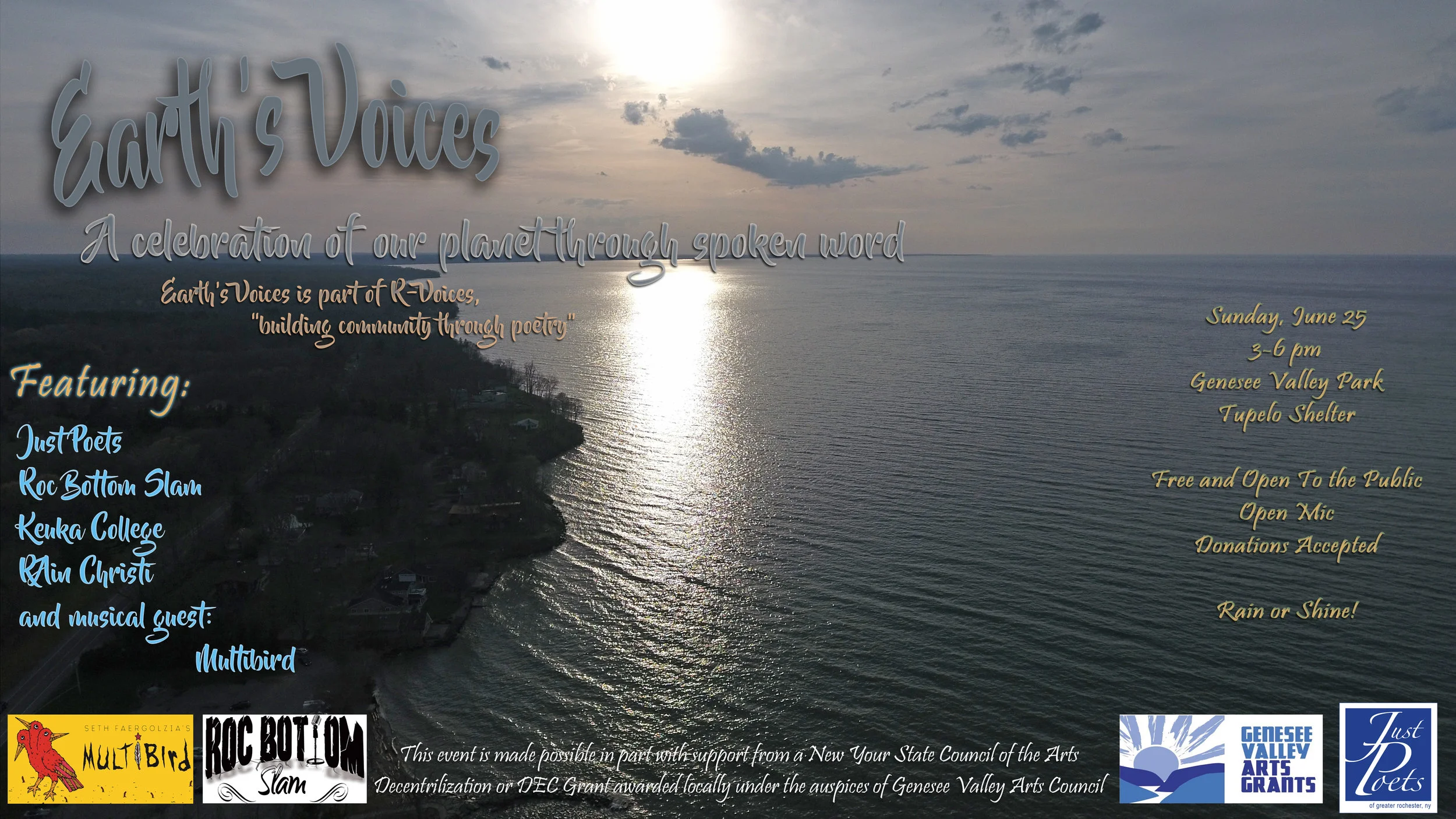 Join us on Sunday, June 25th, for Earth Voices, an afternoon of poetry, fellowship, and music to celebrate the Earth and all it provides us and our community. During these few hours, we will look to connect with and honor the world we live in while increasing awareness and inspiring action to preserve the natural beauty around us. Earth Voices seeks to promote and amplify an open dialogue about the steps we can take to create, engage, and maintain a sustainable relationship with the environment.